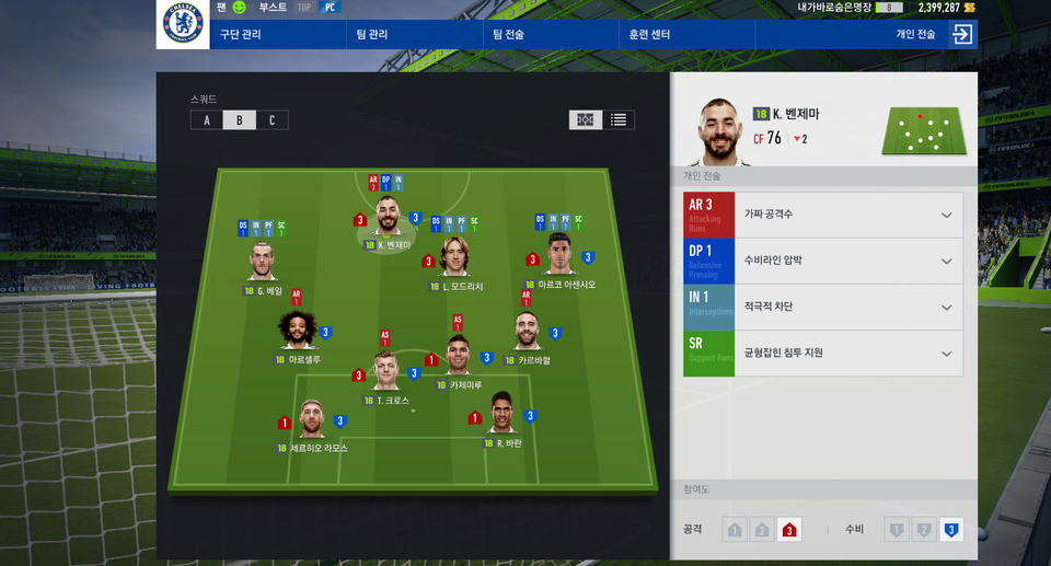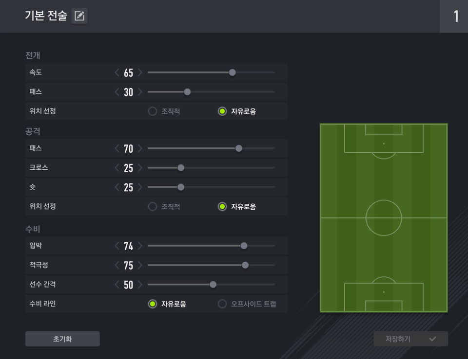 팀전술입니다. 적당히 빠른속도와 짧은 패스의 전개+ 공격진내에서는 유기적 스위칭과 적극적 침투를 위해 패스는 75이상