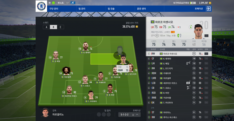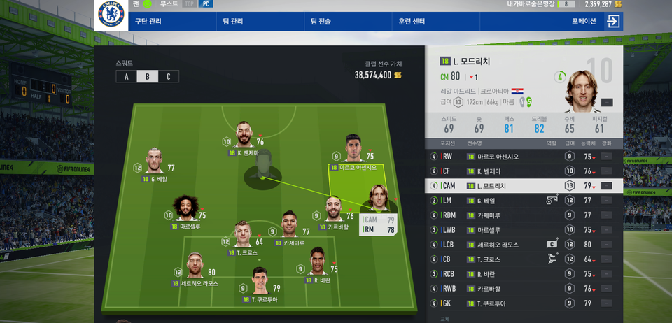 처음에 아센시오자리를 rw로 시작하고 모드리치 즉 cam을 RM 오른쪽 맨아래까지 내려줍니다