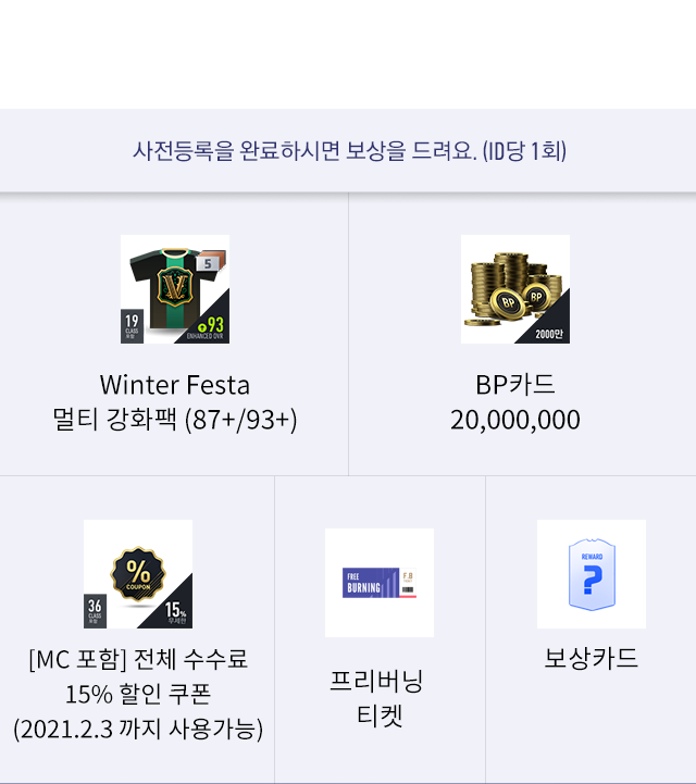 7. FIFA 모바일 사전등록 완료 보상은 사전등록 이벤트 페이지에 로그인한 넥슨 ID에 연결된 감독이 FIFA 모바일에서 사전등록을 완료해야만 받을 수 있습니다.