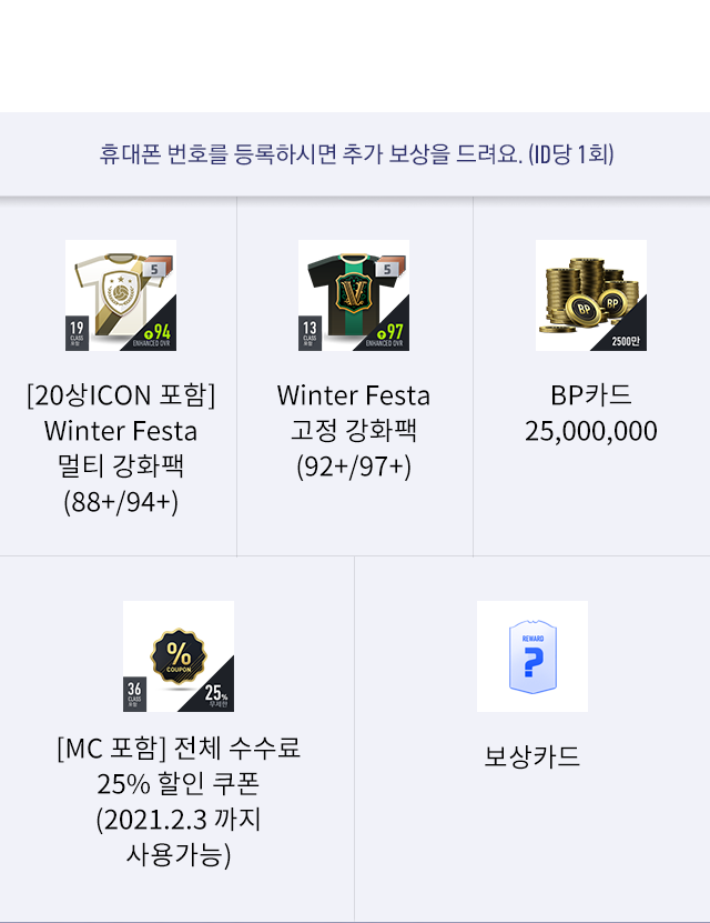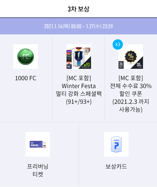 10. 1~3차 기간 보상은 보상 수령 기간 동안 FIFA 온라인 4 또는 FIFA 온라인 4 M에 접속 기록이 1회 이상 있어야 수령 가능합니다.